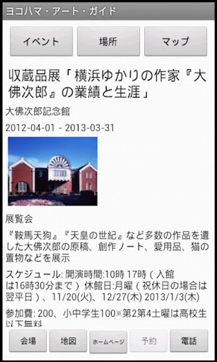 「ヨコハマ・アート・ガイド」は、横浜で開催されるアート関係のイベントを紹介するアプリケーションです。 横浜でアートな気分に浸りたいときにお使い下さい。