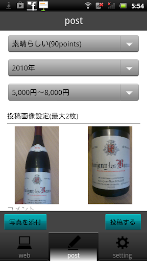 写真だけではなく、ワインの評価、ワインの購入価格、ワインのヴィンテージなどを入力することも可能です。