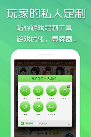 万游助手,玩手游必备神器!不用离开游戏,即可进入专属精品攻略、聊天室、论坛和礼包区,哪里玩不过去了,呼出万游助手帮你吧!结交玩伴,找到组织,一起征战,才有乐趣!