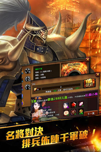 - 招募系統——三國名將盡在其中,不但有英勇無敵的關羽、張飛、趙雲、呂布,還有足智多謀的諸葛亮、周瑜,更有艷絕天下的貂蟬、大小喬,還有眾多深宮美女等你寵幸,如此多人物靜等你來喚醒!