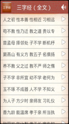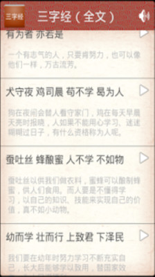 国学启蒙读物《三字经》(全文),短小精悍、琅琅上口,千百年来,家喻户晓,广泛生动而又言简意赅。全文长达1722字,是我国不可多得的宝贵遗产,被联合国教科文组织选入“儿童道德丛书”,加以世界范围的推广,也是儿童的必背读物。其内容涵盖了历史、天文、地理、道德以及一些民间传说,所谓“熟读三字经,可知千古事”。本APP简单实用,适合父母陪伴孩子学习使用,可选择全文朗诵或者逐句朗诵,搭配翻译,让孩子跟读的同时,可以理解文字的涵义和精髓。