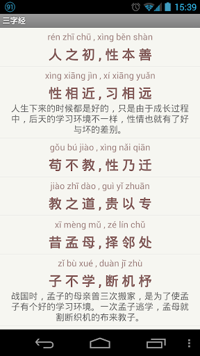 《三字经》与《百家姓》、《千字文》并称为三大国学启蒙读物。《三字经》是中华民族珍贵的文化遗产,它短小精悍、琅琅上口,千百年来,家喻户晓。其内容涵盖了历史、天文、地理、道德以及一些民间传说,所谓“熟读《三字经》,可知千古事”。