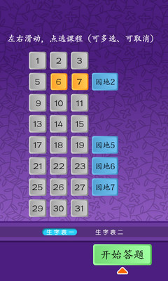 使用:选择对应课程,可多选(参照课本生字表),开始后进行生字拼音标注练习,同时计时和打分。