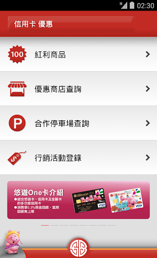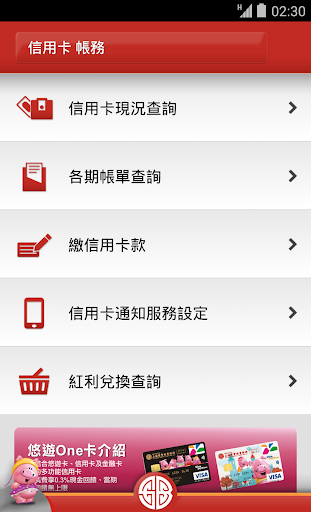 【信用卡】繳納信用卡費,查詢帳單/信用卡額度、信用卡繳款推撥通知、紅利商品兌換、優惠商店/合作停車場查詢、行銷活動登錄等….相關資訊。