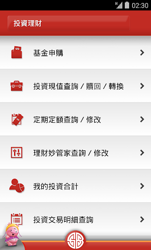 【投資理財】可查詢投資現值、定期定額、投資交易明細、已實現損益及投資組合分析,讓您快速掌握投資現況,依照自己手邊的資金和理財產品市場的變化,隨時進行申購、轉換、回贖、修改及理財妙管家等。