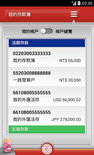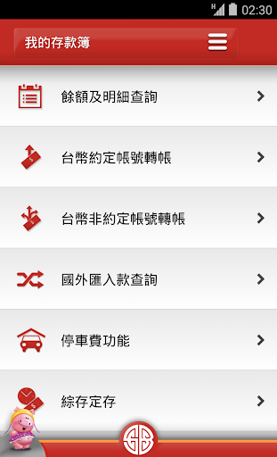 【帳戶】快速總覽您的各項資產概況,並可進一步點選各項存款(活存、支存、定存等)餘額及明細查詢、約定及非約定轉帳交易、國外匯入款查詢、繳納或設定路邊停車費(台北市/新北市/高雄市)等。