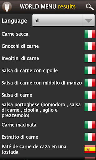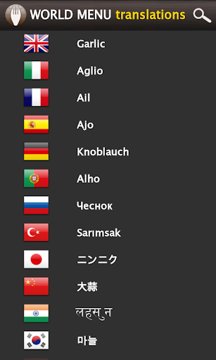 “世界食譜”(World Menu)將幫你把主要食品名稱、配料和食譜翻譯成另外15種語言:英語、意大利語、法語、西班牙語、德語、葡萄牙語、俄語、土耳其語、日語、漢語、印地語、墨西哥語、韓語、阿拉伯語、印尼語和越南語。