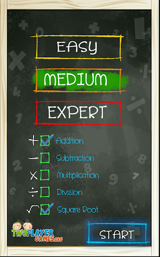 你觉得有一个有竞争力的派别与你的朋友吗?是否确定?您正在下载的2人游戏即可。在这个两个玩家的游戏,您可以与您的朋友从易到难一数学竞赛在3提高水平。通过选择加入游戏,游戏减法,乘法游戏和除法game.You可以停止背景音乐的同时,通过退格key.With这个数学游戏播放或暂停比赛的一个开始游戏,你既可以得到乐趣和发展你的四arithmathical操作,想pratically并给予快速解答。