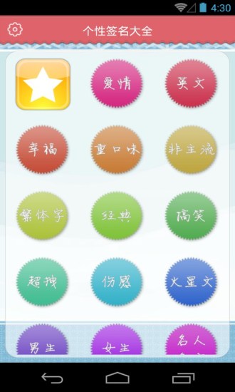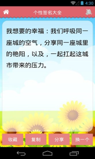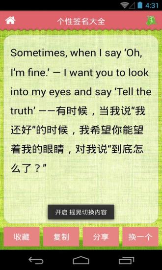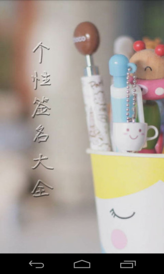 按分类浏览个性签名,还可以自定义关键字搜索相关内容。每个签名均可以复制。个性签名包含大量最新签名,伤感签名、唯美、孤独、回忆、寂寞、非主流、犀利、超拽、情侣签名个性签名、祝福签名、搞笑签名、爱情签名……支持收藏夹离线浏览,摇晃切换内容,支持复制。