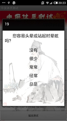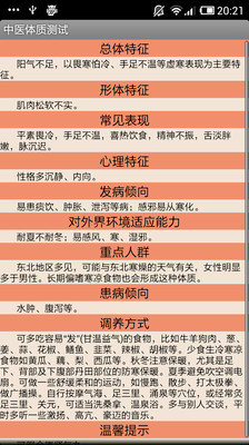 中医体质测试是一款 android 手机上的体质测试软件。本软件严格按照2009年 4月9日发布的《中医体质分类与判定》制作。把人群分为八种不同的体质,通过科学测试后,给出所属体质,体质的形成原因、主要表现及易感疾病,帮助认识自身是何种体质,并从饮食、生活起居、精神、药物、经络调养等方面告诉用户,养生要因人而异、体现个体差异,才能取得事半功倍的效果。