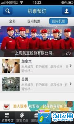中国机票预订能为您找到最低折扣的飞机票,坐高铁不如买张打折机票,您的省钱助手,您的贴心伴侣。应用特点:航班查询、机票预订一站式;淘特价机票,发现你的超值之旅;价格趋势,未来一月机票价格查询; 航班动态,航班延误、晚点、取消等信息实时跟踪。