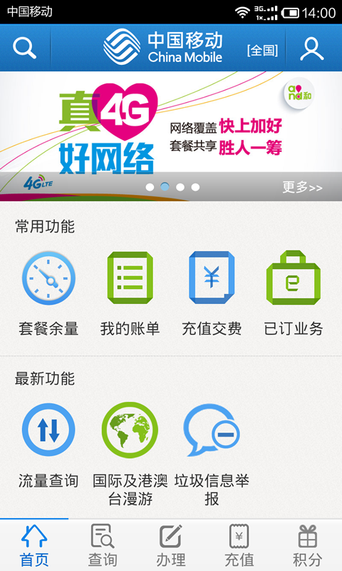 目前功能包括:余额查询、账单查询、套餐余量查询、流量使用查询、积分兑换、已订业务查询、个人信息查询、国际及港澳台漫游资费查询、套餐及业务办理、交费充值、密码修改、营业厅网点查询、WLAN热点查询、优惠资讯搜索等。