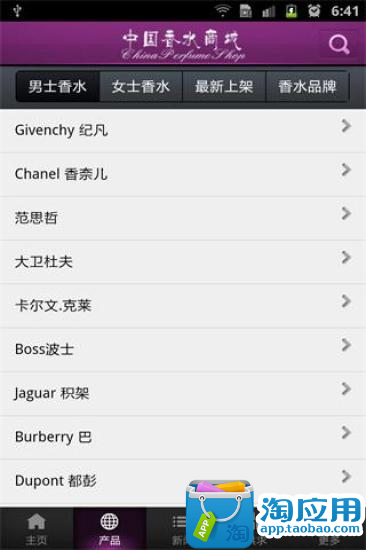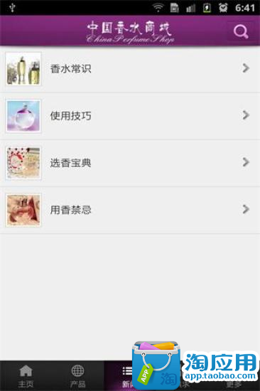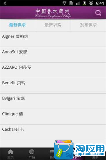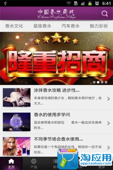 中国香水商城APP手机客户端为您提供关于香水行业的香水常识、香水文化、选香宝典以及使用技巧等信息,同时也为广大香水企业提供一个展示自己产品的平台该客户端面向全国招商,各大企业可在该客户端上发布供求信息,让各大企业以及广大客户更为便捷中国香水商城客户端以紫色为主色调,更能突显美感,该客户端以便捷的浏览方式、强大的应用功能,最新的资讯信息,为广大客户提供了一个丰富的香水行业信息平台,时时刻刻的为您更新,让您爱不释手