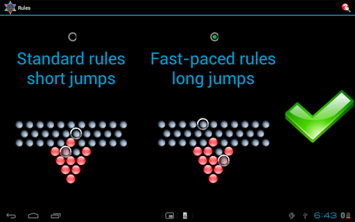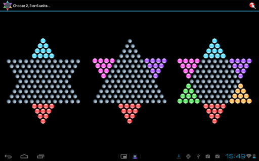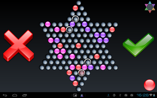 遊戲中,每一方擁有10個棋子。誰最先將己方所有棋子移動到對面相同顏色的區域中,誰就是獲勝者。這個遊戲最多可以有六個玩家。也可以選擇與電腦對戰。