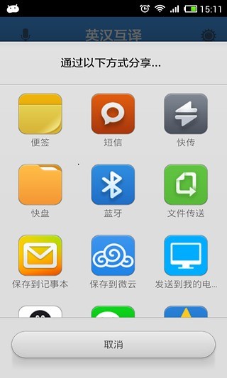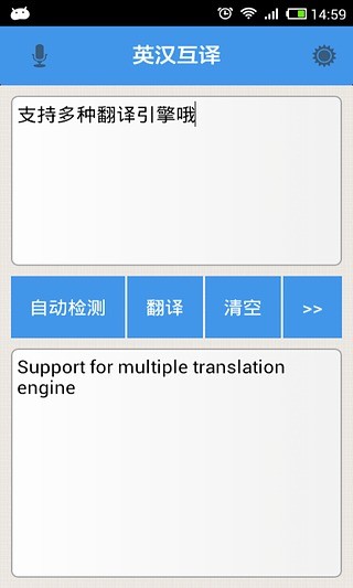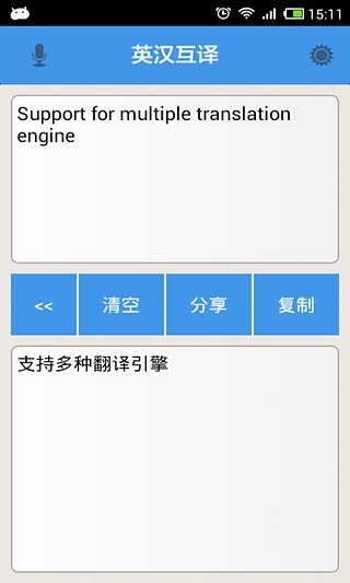软件采用清爽的界面,采用百度,有道翻译引擎,实现了中英文之间的在线互译操作,支持语音输入并提供了复制翻译结果和分享翻译结果的功能.