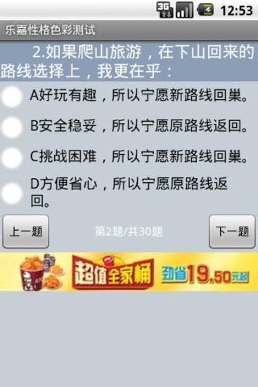 性格色彩学是心理学的一门分科,由心理专家乐嘉创立主要将人的性格分为红、蓝、黄、绿四种这不是一个娱乐测试,而是一个严肃的心理学测试,这个测试的初级目的是以数据方式真正认识自己的性格特点分布,高级目的是准确识别他人性格,与不同性格交往的秘笈,和如何将自己的性格优势修炼到极致这些题目是在研讨会上使用的一套极为专业的版本,并非偶然杜撰(请注意:所有问题没有好坏或对错之分,因此请一定要选择你最自然的反应,而不是你认为最好的或最适合的最后说一句,题目略长,共30题,耐心完成,因为与你的前世有关)