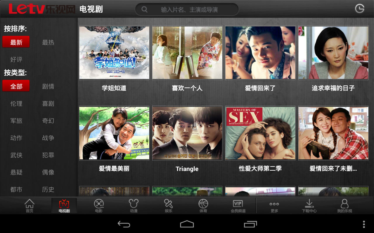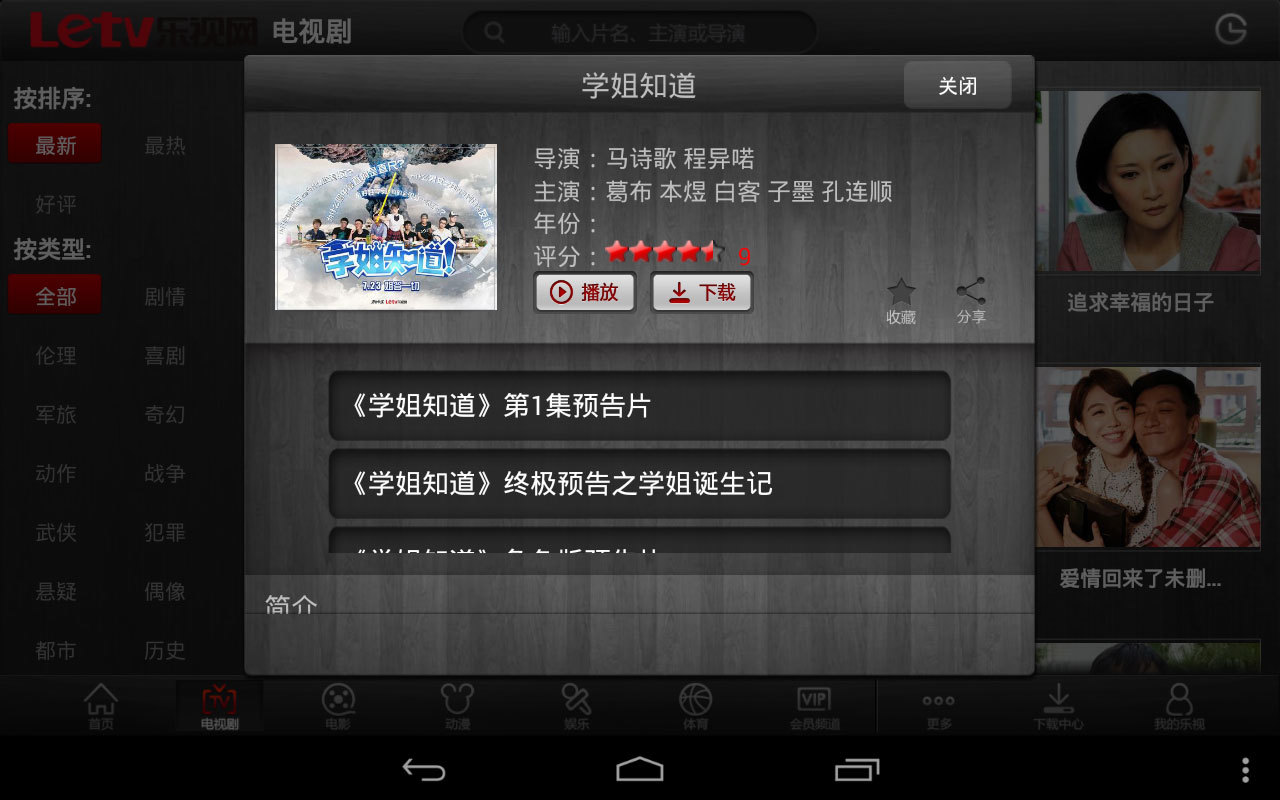乐视出品首部百科喜剧《学姐知道》且看保洁小妹为你“姐”答一切古今中外的奇葩搞笑问题!晚上睡觉都乐醒啦!NBA、CBA、英超、西甲、意甲、法甲、中超、高尔夫、网球,国内外最新最全的体育视频和直播。乐视体育,品质保证!乐视视频HD-免费高清电影电视剧动漫综艺娱乐视频播放器。拥有最多电影、电视剧、综艺、娱乐、动漫、体育、娱乐视频资源。无需注册,可无限量下载,更有追剧,收藏等功能,是您贴心的视频观看播放器。2014精彩不断,热播视频推荐!热播大剧:《古剑奇谭》《意见不钟情》《收获的季节》热门电影:《小时代》《归来》《敢死队》《催眠大师》热播美剧:《性爱大师第二季》《情妇第二季》《逍遥医生第一季》人气动漫:《刀剑神域第二季》《东京残响》《猪猪侠8变身战队》乐视自制:《学姐知道》《青春忏悔录》《北京傲客》精彩综艺:《爸爸去哪儿》《我们一起来》《花样爷爷》【软件特点】最全片源:拥有最多正版视频内容,涵盖欧美大片,热门韩剧,卡通动漫,综艺娱乐等。无限下载:无限量的下载让用户随时随地随心看任何一部大片,即使在非网络环境下也能观看!卫视直播:支持数十家电视台,精彩直播从不间断,让你的手机一秒钟变电视。一键分享:快速分享到微博、QQ和微信等社交平台,精彩内容与好友分享!----------------------------[联系我们]客服邮箱:mobile@letv.com新浪微博:@乐视无线如遇闪退等问题,请加我们的QQ官方群:193486831,您的反馈有助于我们提高服务质量