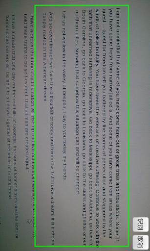 * 利用手机拍摄印刷体文字或是电脑屏幕上的文字,自动识别全文,框选,划线或点选识别部分文字