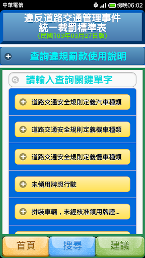 提供查詢各項交通違規的罰款金額與處罰內容,並且可以使用口語化字詞查詢違規項目,例如可以輸入烏龜車,飆車,酒駕等口語化詞語查詢,也可以輸入關鍵單字查詢。