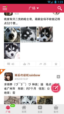 广场:有领养专区、问答专区、动态专区,可以在这里发现更多宠物故事,也可以发布领养,和养宠用户相互交流沟通;
