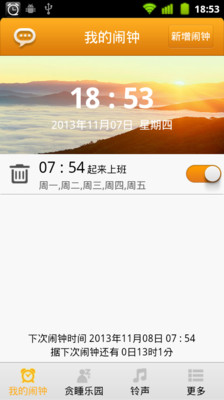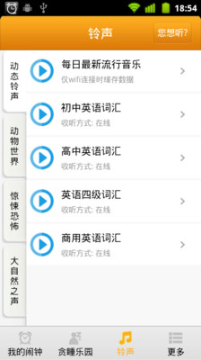爱生活,从起床开始! 灵活多样的铃声选择: 系统铃声,本地音乐,网络铃声,动态铃声,带给您每个特别的早晨。 想用自己搞怪或动人的声音叫醒密友吗?想把录音变成TOM猫似的可爱吗?只需要简单的录制发送即可,赶快行动,为您们的友谊加点料吧! 闹钟还可以是学习帮手,不会吧?是的,动态铃声除了流行音乐频道,还有背单词频道,一日之"记"在于晨哦! 关键字: 闹钟,英语学习,密友,搞笑,时钟,叫醒服务,单词,学习,倒计时