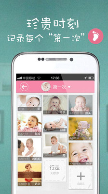 丰富的记录标签:包括新鲜事、第一次、喂养、拉撒、睡觉、出游、娱乐、才艺、早教账单、疫苗、就诊、测量 十三类。其中“第一次”还包括笑、吃手、抬头、辅食、翻身、坐、叫妈妈、爬、长牙、站立、行走十一个小类,而且允许自定义哦~! 涵盖宝宝成长方方面面。让这些闪亮时刻永远珍藏。