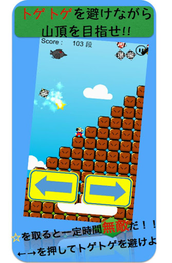 「逃げ☆トゲ〜人生山ありトゲあり〜」は山頂から転げ落ちてくるトゲトゲを避けながらおじさんが疾走するゲームです。