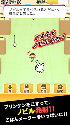 かわいいプリンケンの成長に必要なのは、畑で収穫できる不思議な野草ノビル。これを発射してプリンケンに命中すれば食べて、ごはんメーターが増えていき、いっぱいになると身長が伸び、育ちます。
