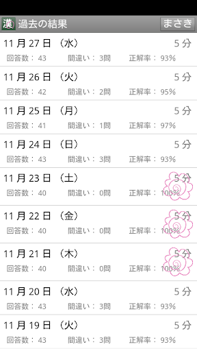 学習の結果は、日毎/漢字(読み)毎で記録されるため、過去の結果より学習状況や苦手な漢字を把握できます。