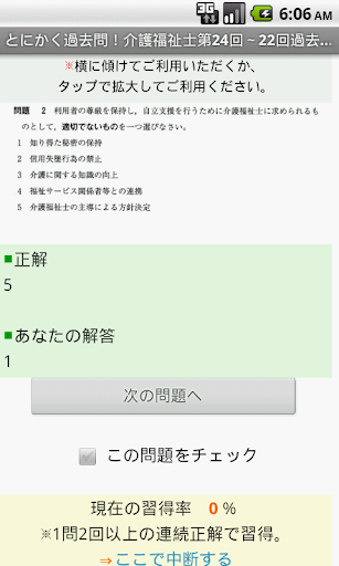 問題を解く毎に、その問題の連続正解をもとに、問題集全体における習得率が割り出されます。繰り返し「習得度100%」を目指すと自然と暗記/習得ができるシステムです。