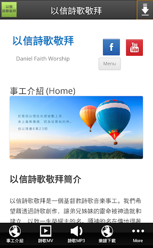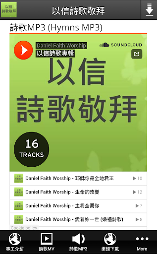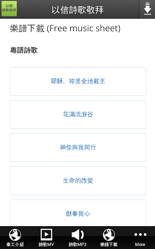 本程式包含事工簡介、詩歌MP3、詩歌MV、樂譜下載等,請多多支持本詩歌創作事工!