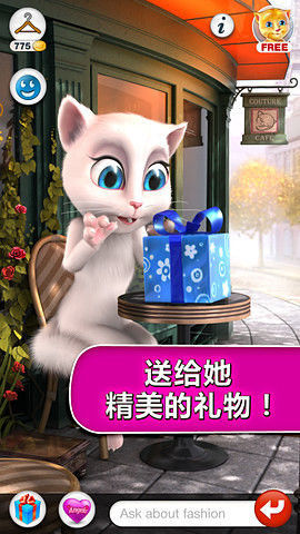 国内版是Out Fit 7 Ltd.专门针对中国市场开发的版本,更适合国内用户,如视频共享国内版支持腾讯微博、新浪微博、QQ空间和优酷。用户下载时请注意!(若要使用腾讯、新浪微博,QQ空间共享需要安装其客户端.) 游戏玩法 - 如果抚摸安吉拉,她会高兴,如果戳她,就会发怒。 - 使用“礼物”按钮为她购买饮料、饰品、衣服、化妆品等等。 - 使用“心形”按钮让安吉拉给你读一个签饼。 - 使用“衣架”按钮访问安吉拉的衣橱,并改变她的外貌。 - 使用“面孔”按钮打开前摄像头,通过面目表情和安吉拉交流(如点头、摇头、微笑、打哈欠或伸舌头)。 - 低档设备(采用单核CPU)和没有前置摄像头的设备中没有“面孔”按钮。
