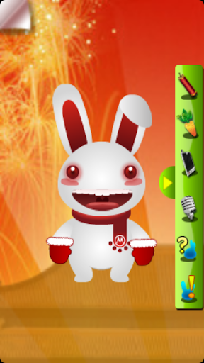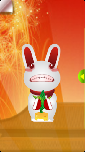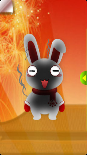 可爱的拜年兔能给您送上新年的祝福,它还能以滑稽的语音重复您的话。拜年兔可以做出如下的动作:放炮竹、拔萝卜、打手机;您可以用手指摸它的眼睛、脸、肚子和脚,它会做出各种可爱的动作。您还可以用手指在屏幕空白处按住一段时间,这时会出现一个胡萝卜,试试把萝卜喂给拜年兔吧,吃不到的话它会很失望的呦。