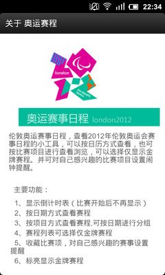 伦敦奥运赛事日程,查看2012年伦敦奥运会赛事日程的小工具,可以按日历方式查看,也可按比赛项目进行查看浏览,可以选择仅显示金牌赛程。并可对自己感兴趣的比赛项目设置闹钟提醒。