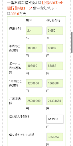 現在の住宅ローンの借入情報「わずか4項目の入力情報」から、借り換えた際にいくらお得になるのか?どの住宅ローンが借り換えメリットが大きいのかを瞬時に診断する診断アプリです。