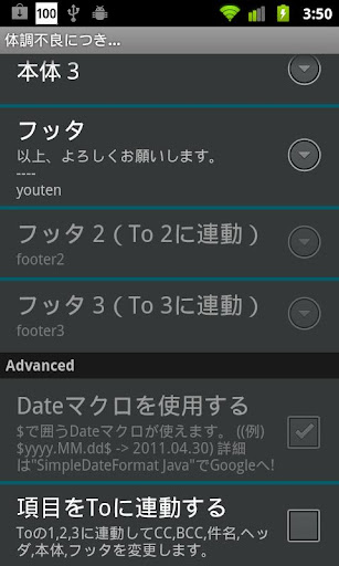 「項目をToに連動する」に対応しました。設定からチェックをONにすると、To以降のヘッダ・本文・フッタ等全て項目が「Toの何番目を選んだか」によって連動して自動的に入れ替わります。緊急時に複数の送信先・メール内容を変えたい際に有効です。