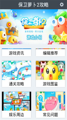 保卫萝卜2是一款可爱风格塔防小游戏,容易上手、老少皆宜,内置新手引导。游戏含有丰富的关卡和主题包,拥有各自风格特色的多种防御塔,有趣的音效设定和搞怪的怪物造型及名字大大地增加了游戏的趣味性。玩家还可以收集道具和怪物,完成更多的成就。本应用保卫萝卜II攻略介绍了保卫萝卜的游戏资讯、通关攻略、游戏图鉴等攻略技巧。