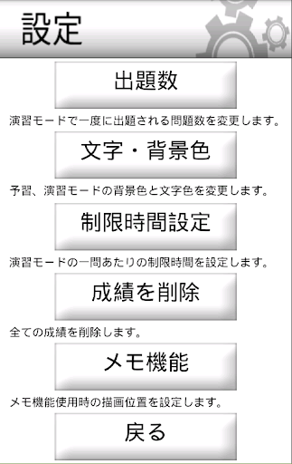 ランダムで問題が出題されます。出題される問題数、制限時間も設定可能。