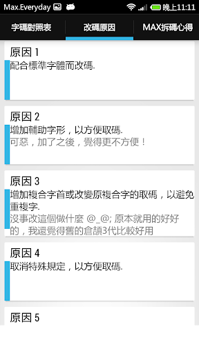 1. 學習倉頡三代的在使用倉頡五代時會有些字因為改碼了拆不出來, 列出對照表和改碼原因, 還有附上Max的拆碼心得, 應該有助於您從3代切換到5代.