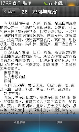 使用方法:左右划动屏幕即可翻页;上下划动屏幕可以调整字体大小;遇到喜欢的菜肴可以通过屏幕底部的推出式菜单进行收藏,方便以后查找。