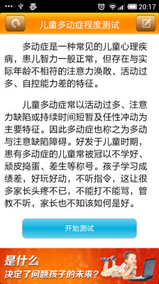 你的孩子是否聪明伶俐却学习成绩起伏不定,有时候甚至一落到底。孩子顽皮好动,不听指令,甚至欺负同学,常备老师冠以不学好、顽皮捣蛋、差生等名生?这个时候要注意了,也许并不是你的孩子不对,而是他患上了多动症,通过本测试,你可以看出你的孩子是否患有多动症,和患有多动症的程度。