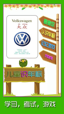 儿童教育,认识汽车标志,有声读物,早教 ,阅读教育 ,故事读物,智力开发。儿童识汽车标志是一款儿童认识所有汽车标志的教学软件。采用交互式学习方式, 由可爱的卡通卡片和小朋友进行互动,场景漂亮可爱。帮助宝宝在玩耍中学习。并且通过考试游戏和记忆游戏的模式增加学习的娱乐。