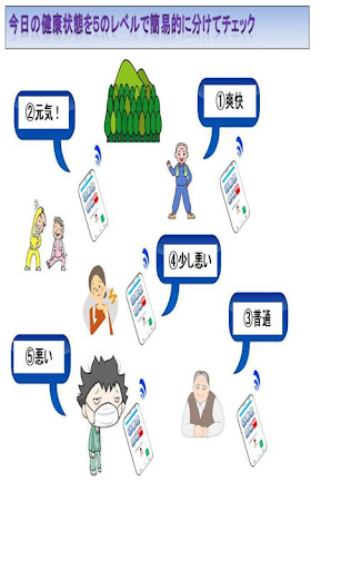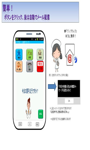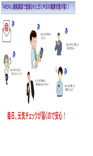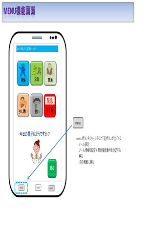 (操作)メール設定情報は「健康チェック者名(メールに表示したい名前)」、端末設定の「Gmailアカウント」、「Gmaulパスワード」、「Gmailアドレス」を入力して頂き、「mainアドレス~」に健康チェック状態のメール受信者のアドレスを設定して頂ければ、健康チェック者が5つの健康状態(イラストの元気状態)+緊急ボタンの状態を1クリックで自動でメールを配信します。