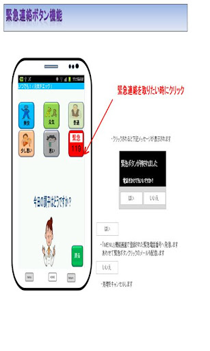 →緊急ボタンをクリックすると一旦、発信の確認メッセージボックスが出てきますので誤操作時は、「いいえ」で取りやめてください。