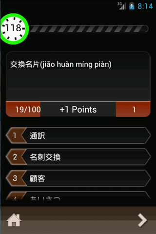 與實際檢定考試相同的4選項選擇題型。依回答時間決定得分多寡。答錯則會扣分。
