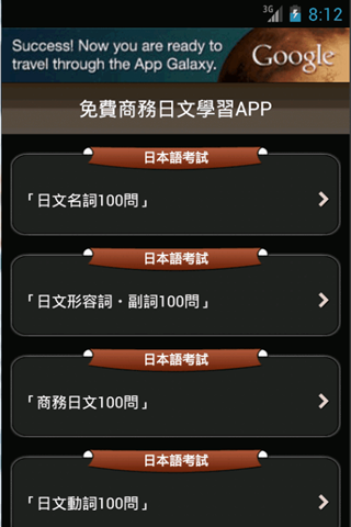 測驗程式裡有各級名詞100題、動詞100題、形容詞・副詞100題、商務日文100題。