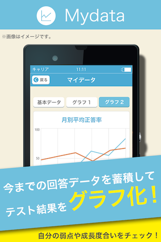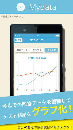 試験問題を解いた成績はグラフで表示されます。グラフの偏りを見ることで、自分の苦手分野が一目で確認することが可能です。問題を解いた成績は記録されてグラフ化されるため、解き続けることで自分の成長度合いを実感することができます。