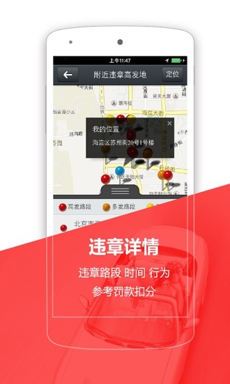 车辆违章克星,8000万车友出行必备!精选各城市违章高发路段,地图提醒附近违章易发路段,倡导广大车主朋友遵守交通安全规则,从源头上有效降低违章的发生。支持全国300多城市违章查询服务,方便您随时随地查询车辆违章情况!