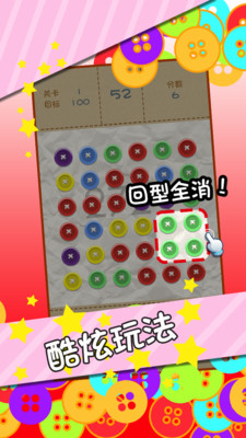 ※玩法※:连接相邻同色纽扣,即可消除,环形消除时,同一颜色所有纽扣全部消除且三倍分数,具体可参照游戏首页新手教程。