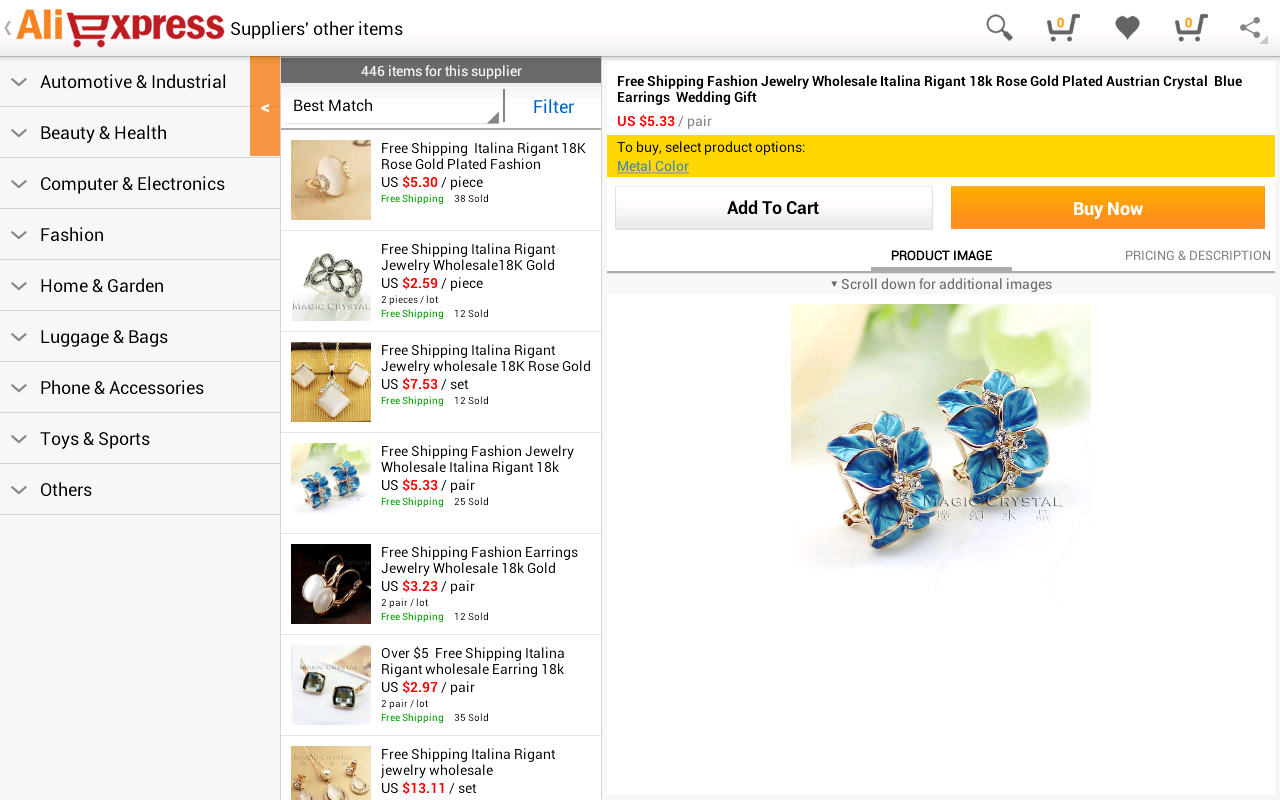 AliExpress HD1.5.2全球速卖通AliExpress是阿里巴巴为帮助中小企业接触海外终端,拓展利润空间而全力打造的融合订单、支付、物流于一体的外贸在线交易平台。速卖通平台通过互联网的方式缩短优化外贸产业供应链,帮助中国商家获得更高的利润。通过两年多的发展,速卖通已经成长为全球最大的在线外贸交易平台。软件功能:1.拥有数以百万计的产品和日常交易2.搜索超过10万的产品和提供每日的交易。3.便利快捷地管理订单4.方便地跟进物流和跟踪订单,并很容易地与卖家沟通,不论您身在何处。5.支付安全,Escrow保证资金安全。6.安全,方便地进行移动支付。安全付款并保证全球速卖通买家保护。
